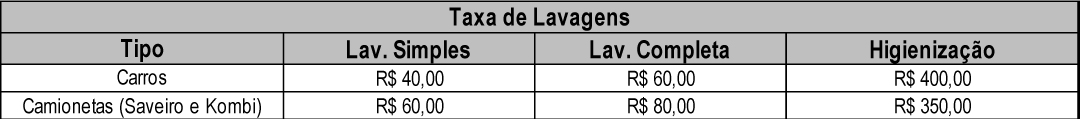 - O veículo é entregue limpo e a Locadora irá cobrar uma taxa de serviço em conformidade com o estado do veículo, quais sejam: lavagem simples, completa ou higienização, de acordo com a tabela da própria locadora;